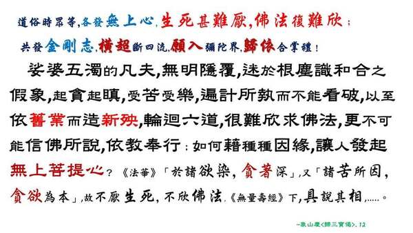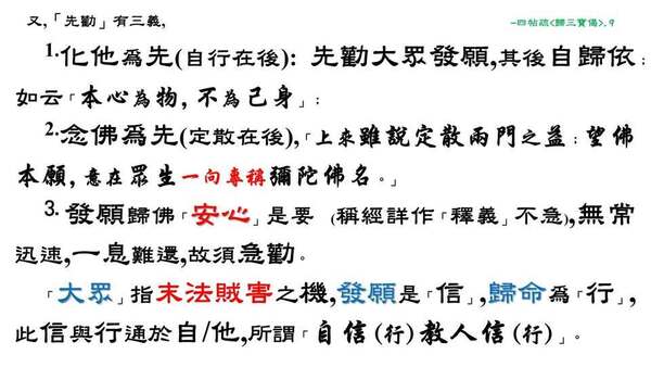 (3).發願歸佛,「安心」為要 (依經造疏之「釋義」不急),因為,無常迅速,一息難還,故須「急勸」。
