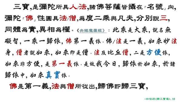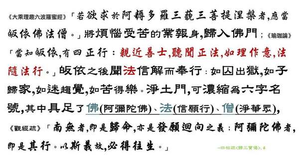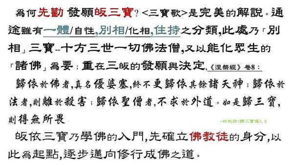 《觀經疏》開篇,為什麼先勸大眾「發願,皈依」三寶? 太虛大師<三寶歌>[1]有完美的解說。通途而言,「三寶」雖有三種、四種、六種之分類,佛教界一般的入門歸依是「住持」世間的三寶[2],進而歸依「化相」(別體)三寶[3],最終是自歸自性(一體) [4]三寶。而一切三寶中,又以說法度眾的「諸佛」為要(根本)。皈依的重點,在於明確的認知、抉擇與發願,《涅槃經》卷8: