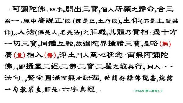 「阿彌陀佛」四字,開出淨土三寶,而念佛人的至誠歸命,合三寶為「一心」;經中廣說正/依(佛/土),主/伴(佛/僧),人/法(佛/名)之莊嚴,盡十方一切三寶,同體(法性真如)互融,可說是「略(無)、廣(量)」相入(壽),淨行者至心稱念「南無阿彌陀佛」,即可攝盡三經/三佛/三寶/三嚴(淨土依正)之教與行,同入「一法句」,清淨圓滿而無所缺漏,可謂是「六字真經」[9]也。