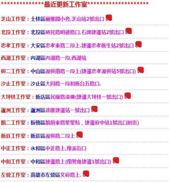 台北 信義 南港 大同 松山 士林 北投 大安 內湖 中山 萬華 新北 汐止 文山 新店 土城 三重 蘆洲 板橋 新莊 永和 中和 台中 台中市北屯 台中市東 高雄 高雄市左營 新竹 新竹縣竹北市 桃園 桃園市桃園 桃園市蘆竹 桃園市中壢 台南 台南市中西 嘉義 嘉義市西區