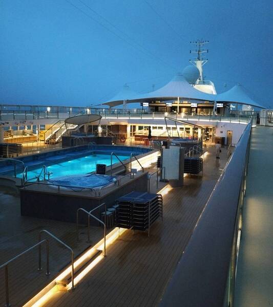 甲板泳池區是溫水的游泳池,不過爸媽玩不起來,就跑去看表演。