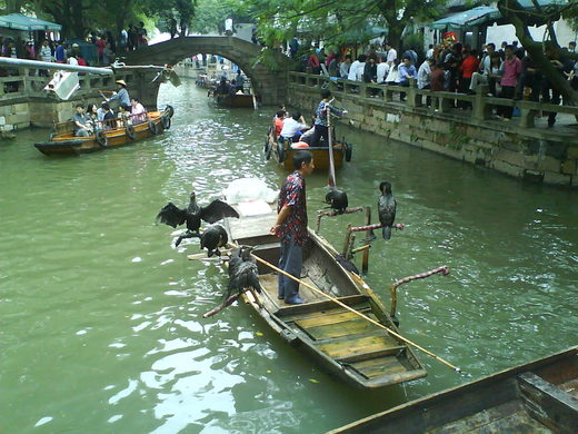 我看到好多隻看起來像烏鴉的鳥類,被一個人指揮著去捕魚,魚鷹捕魚的方式是用嘴去抓,可是牠們無法將魚給吞下去,因為牠們的脖子已都被綁上鐵絲了…而漁夫看到魚鷹有捉到魚時,就會上前去把那條魚拔出來,看的我們是嘆為觀止~~~可換個方向想,那些魚鷹也很可憐…