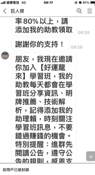 2、當被害者上鉤後,歹徒會介紹其他「客服、老師、助理」同夥加 LINE 聯繫或加入LINE投資群組,並提供假投資網站或App給被害人註冊、下載安裝及操作,此時LINE群組內不斷有其他假學員獲利貼文。