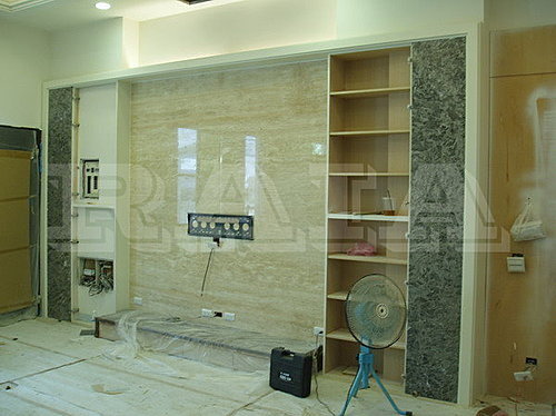 RAIA瑞亞石材 主牆 電視牆( 洞石 , 霸王花 ) (上) 洞石屬於化石類石材 是一種紋路性質的大理石 電視主牆施作 通常都以二片大板或是四片大板對秤對花為主 如果還有其他疑問 歡迎大...