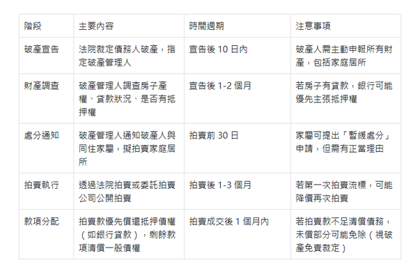 - 無論房子是「自有無貸」「仍在貸款中」,還是「登記在配偶名下但屬於夫妻共同財產」,只要被認定為「破產債務人的責任財產」,就可能面臨拍賣。