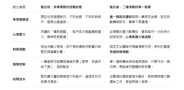 - 這過程猶如將一支散亂的部隊重新整編:您不再需要分別面對多家債權機構的還款要求、利率變化和催收通知。
