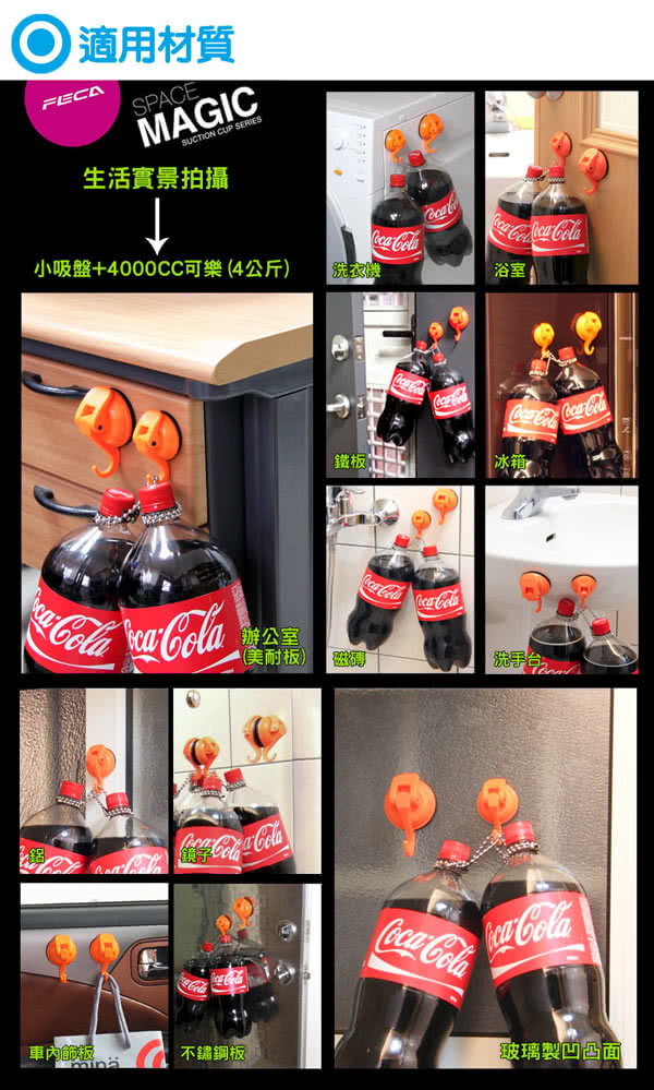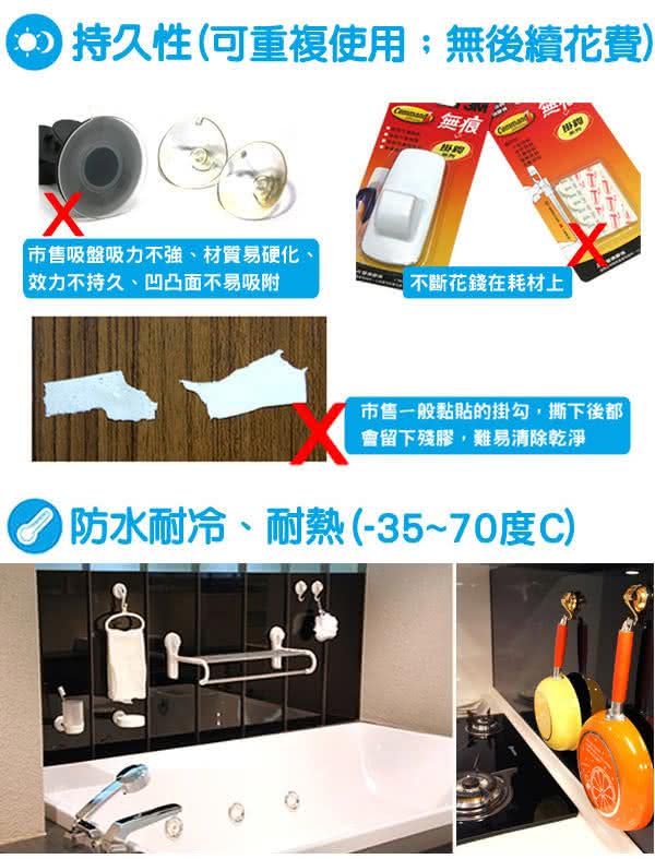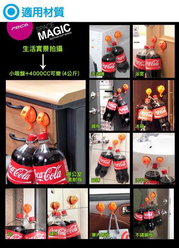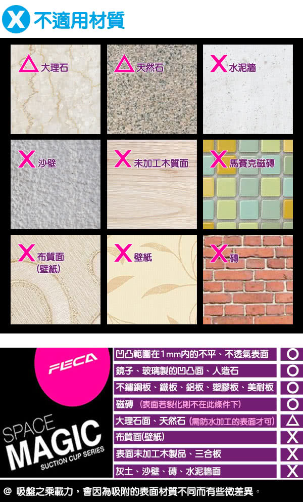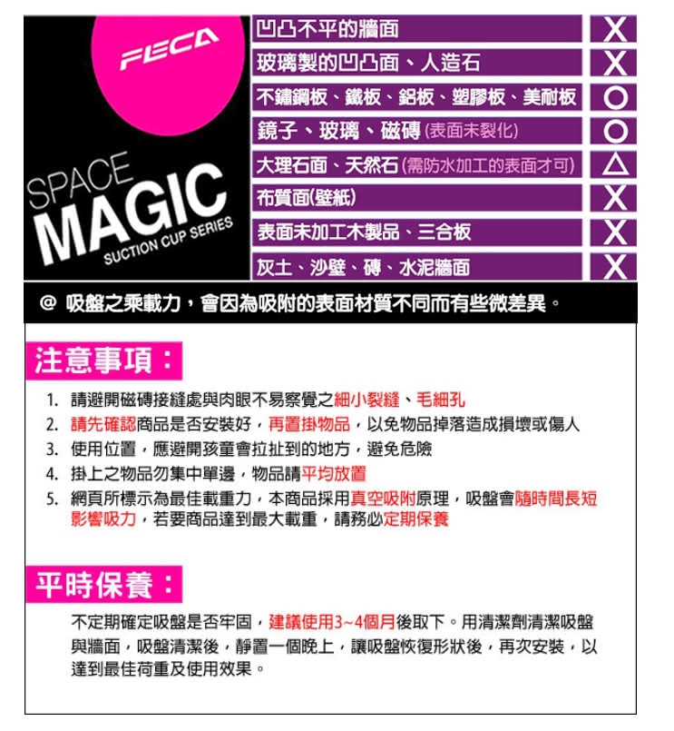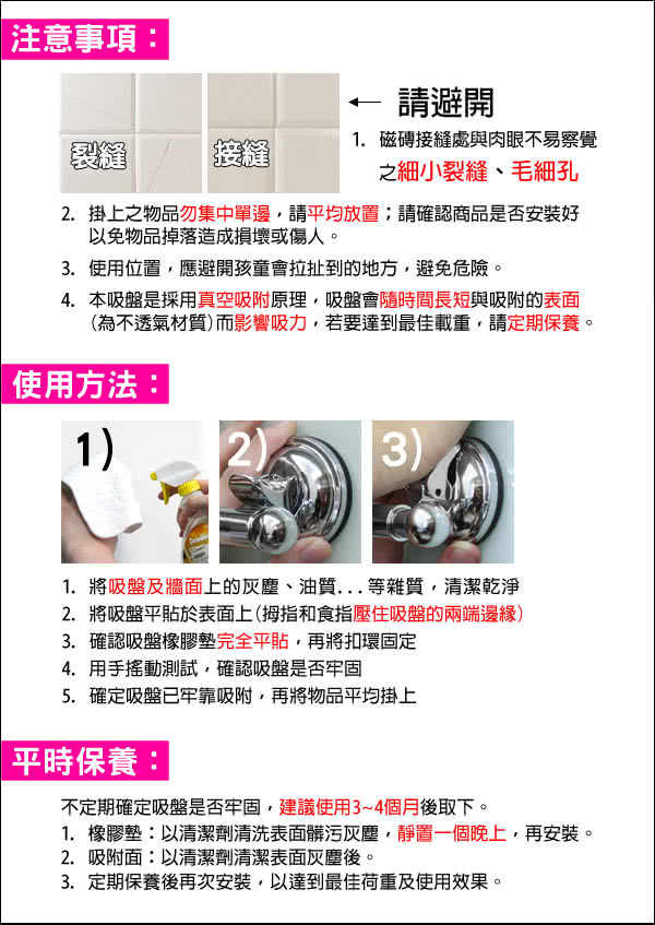 注意事項1.使用前需將吸附面擦拭乾淨,確認牢固後方可使用2.建議2-3個月取下清潔重新吸附,並勿超過標示之荷重3.吸附面積需大於吸盤面,凹凸面高低差勿超過0.4mm4.建議橡膠墊表面沾水再吸附,吸附效果更佳5.不適用水泥牆面、天然石材、木板、壁紙及有裂縫或無上釉瓷磚等透氣之表面6.橡膠墊含有天然油脂,避免使用於淺色、會吸附油脂之透氣表面,防止油脂殘留7.未吸附狀態請卸除壓板,保持橡膠墊平整8.請勿放置貴重物品或易碎品,如有損壞恕不負責