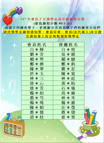 107年度獎學金錄取名單(高中組)