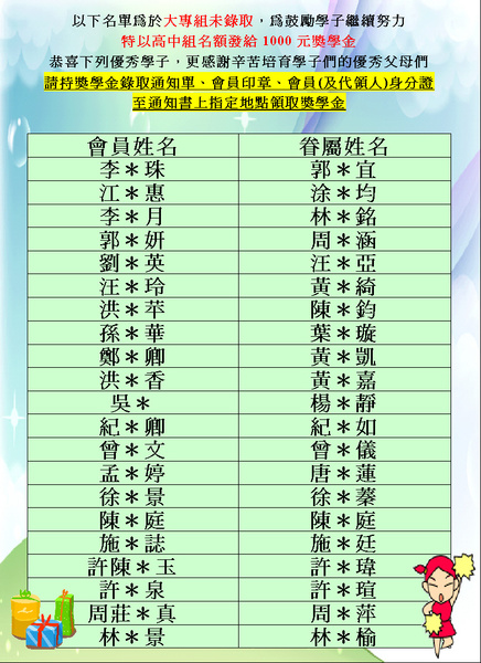 107年度獎學金錄取名單(大專組)