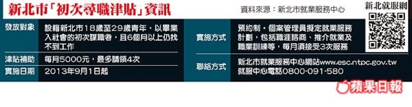 新北市勞工局長謝政達表示,據行政院主計處統計,全台15歲至29歲的失業率為17%,初次尋職青年平均失業長達7個月以上;而新北市年滿18歲至29歲的社會新鮮人、連續失業6個月以上的,約有6700多人,其中約1000多人有工作意願,為避免新鮮人失業周期拉長,導致未來進入職場更困難,因此下月一日開始實施「初次尋職津貼」;但不願工作、接受輔導的啃老族、尼特族,則無法請領。