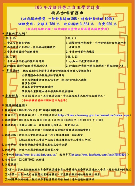 106年度上半年六月每星期日《精品咖啡實務班》