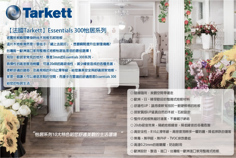 今天要跟大家分享的是【法國Tarkett】Essentials 300 怡居系列(歐洲進口整捲式地板-262 銀白崁條深灰色木紋 經典尺寸2m*1.5m)好用之程度,其實常聽老媽和隔壁鄰居們在誇它,so ..我對這款保溫的印象也就一直都蠻好的~~~ 難得終於被我抓到機會在特價,就趁機入手收藏起來用。