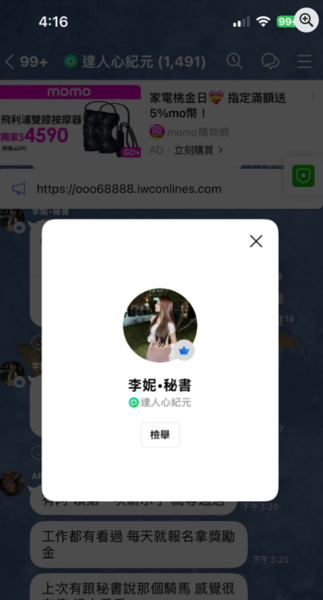 2️⃣ 當被害者上鉤後,歹徒會介紹其他「客服、老師、助理」同夥加 LINE 聯繫或加入LINE投資群組,並提供假投資網站或App給被害人註冊、下載安裝及操作,此時LINE群組內不斷有其他假學員獲利貼文。