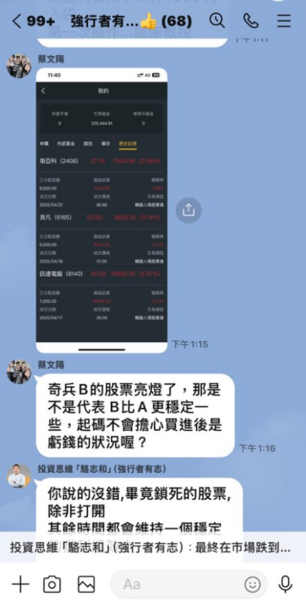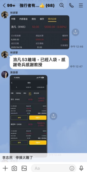 2️⃣ 當被害者上鉤後,歹徒會介紹其他「客服、老師、助理」同夥加 LINE 聯繫或加入LINE投資群組,並提供假投資網站或App給被害人註冊、下載安裝及操作,此時LINE群組內不斷有其他假學員獲利貼文。