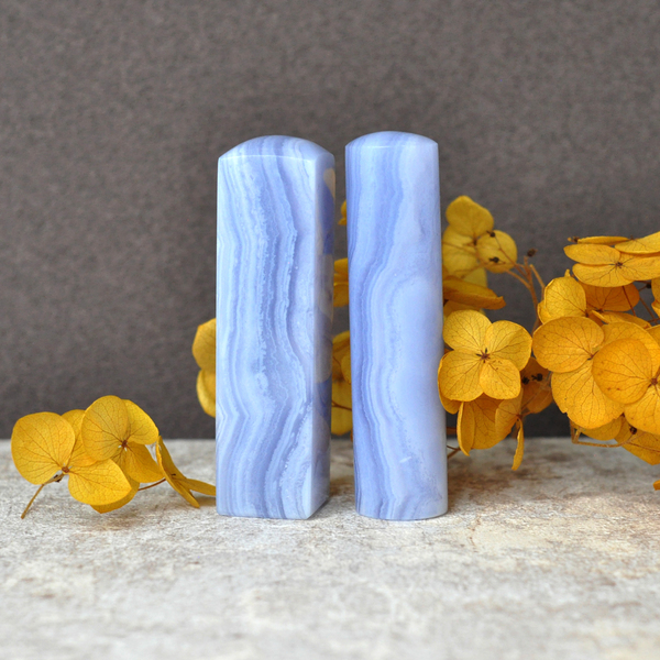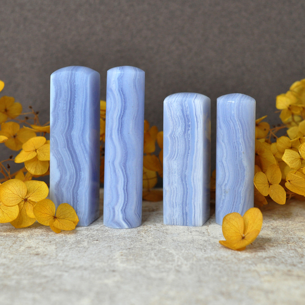👉 當選購印章時,除了價格和照片外,建議您親自選購並觀察貨物的品質,實際拿起印章在手上挑選、觀察印材的品質,包括用料的充足程度、重量、密度、細膩程度、尺寸大小、紋理色澤、透光度和拋光度等方面,以確保您所選擇的藍紋瑪瑙印章具有良好的品質;若無法實際到店挑選,我們也提供360度線上選章的服務,讓您能夠遠端挑選心儀的印章材質。