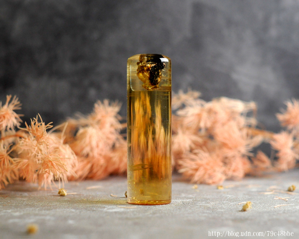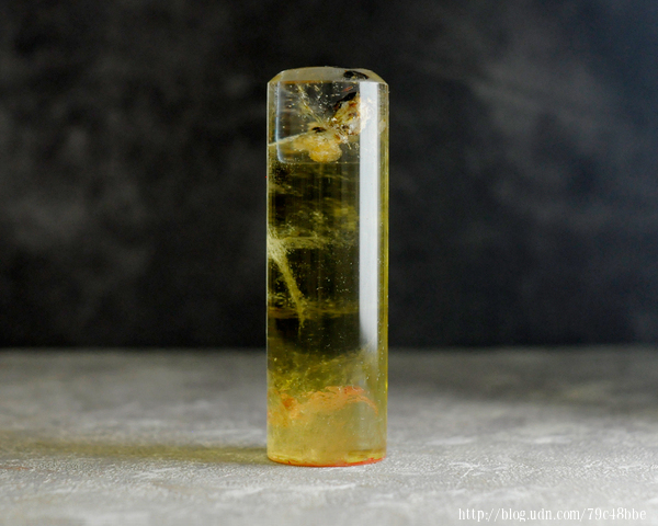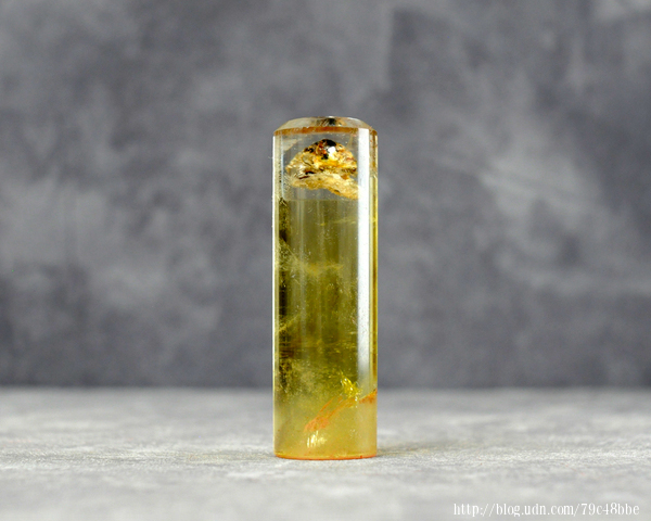 黃水晶質地較硬但脆性高,因此在加工時無法進行一般封蠟或側封等高溫處理,臍帶章僅能採用「上崁式」製作。