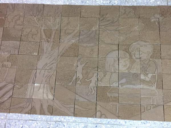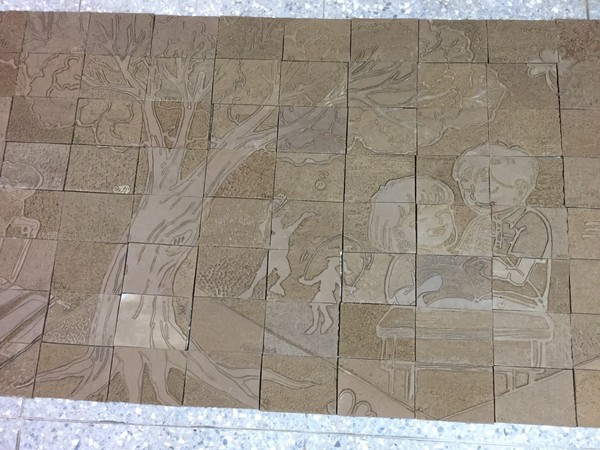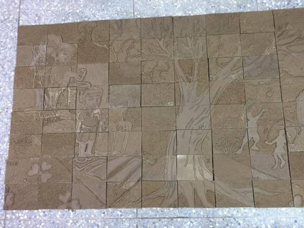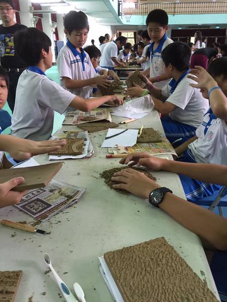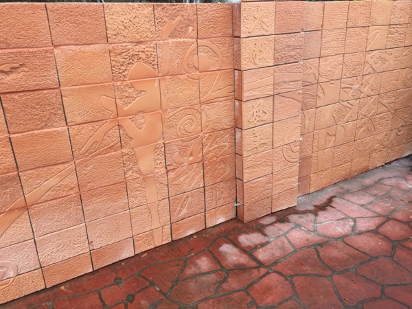 陶磚牆集體創作,陽刻窯前雕,採用磚雕技法,融入在地大肚山赭紅土為創作素材原料,結合圖騰,呈現再地風情特色與學子活潑多才的一面。兩幅集體創作共計320塊陶板。