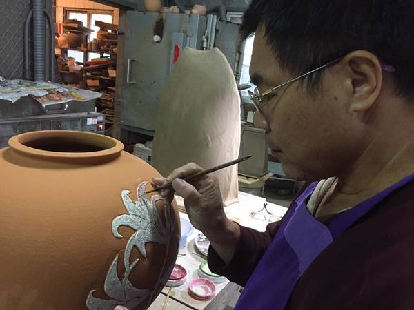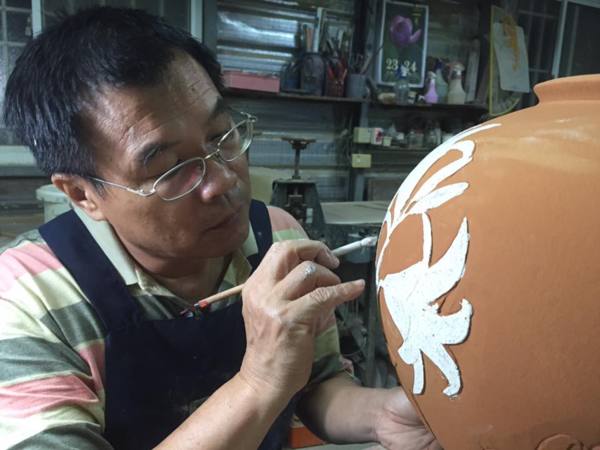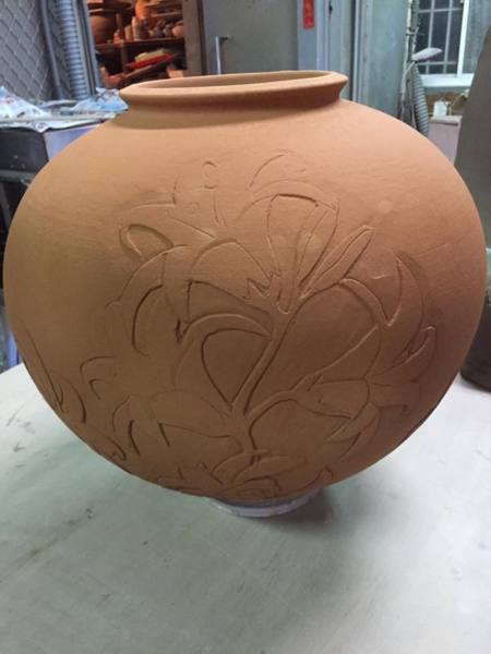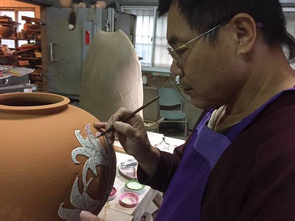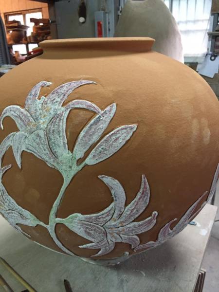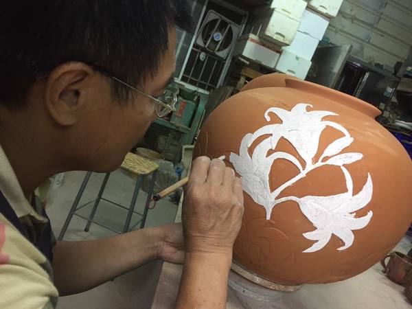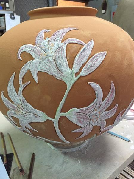 以大肚山土繪大肚山-1,用在地大肚山紅土的創作,以大肚山岩礦調配白岩沙釉繪大肚山脈之寶'野百合花'