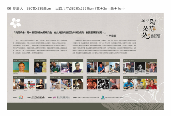 2017陶花朵朵.花都陶藝美學特展,於2017年9月30-11月12日假台中市港區藝術中心舉行,並於10月1日早上10:30芬開幕,本次展覽游23位陶藝家,屏除傳統展櫃展覽方式,採用情境佈置,由情境主題結合陶藝創作,由陶藝作家單件陶藝創作融合情境成為一件大作品,-----各組作品概況