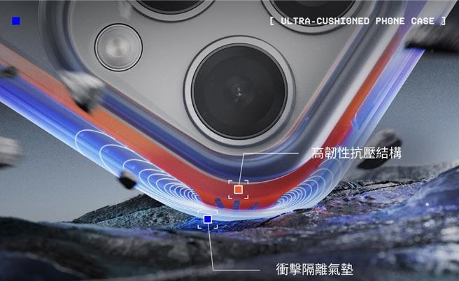 AirX 極致氣墊緩衝手機殼搭載的「內傷防護複合系統」為手機打造一套「多向分散、弱化衝擊」的防護機制。「衝擊隔離氣墊」猶如汽車安全氣囊,在第一時間封鎖及吸收衝擊力道。「高韌性抗壓結構」則如同車輛撞擊潰縮區概念,將瞬間撞擊延緩釋放,轉化為可承受的能量分佈。