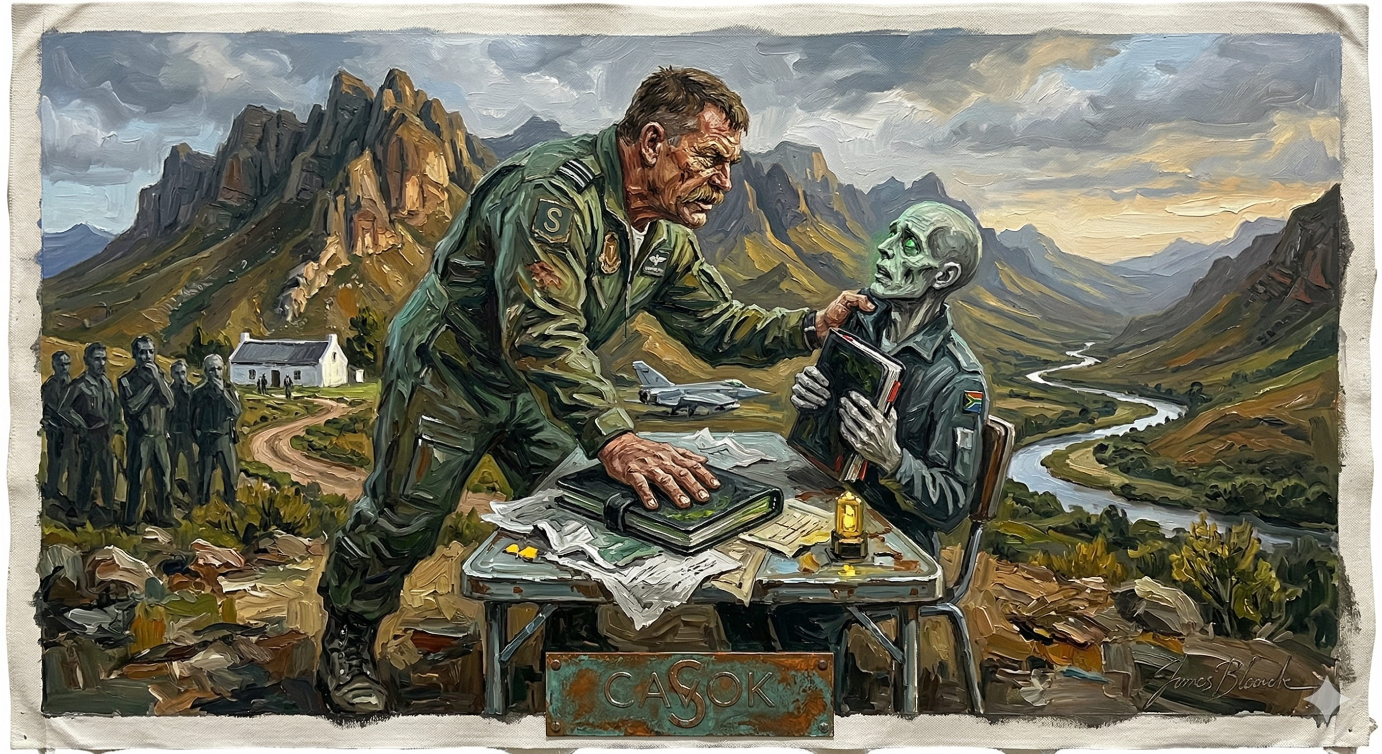 伊斯特普拉空軍基地(Ysterplaat Air Force Base)的柏油上,開普敦的烈日不只熱情照耀,而是在審訊你。少尉約拿·伯朗契(Jonas Blanche)正以僵硬且顫抖的四肢,保持立正姿勢,灼熱的高溫反而退居其次,因為眼前的男人擋住地平線,魁梧肩寬遮蔽了身後的桌山與魔鬼峰。約拿不敢抬頭,只能盯著對方肩頭那三座金色城堡,好望堡的圖騰不是裝飾,是三座壓在他脊樑上的大山。