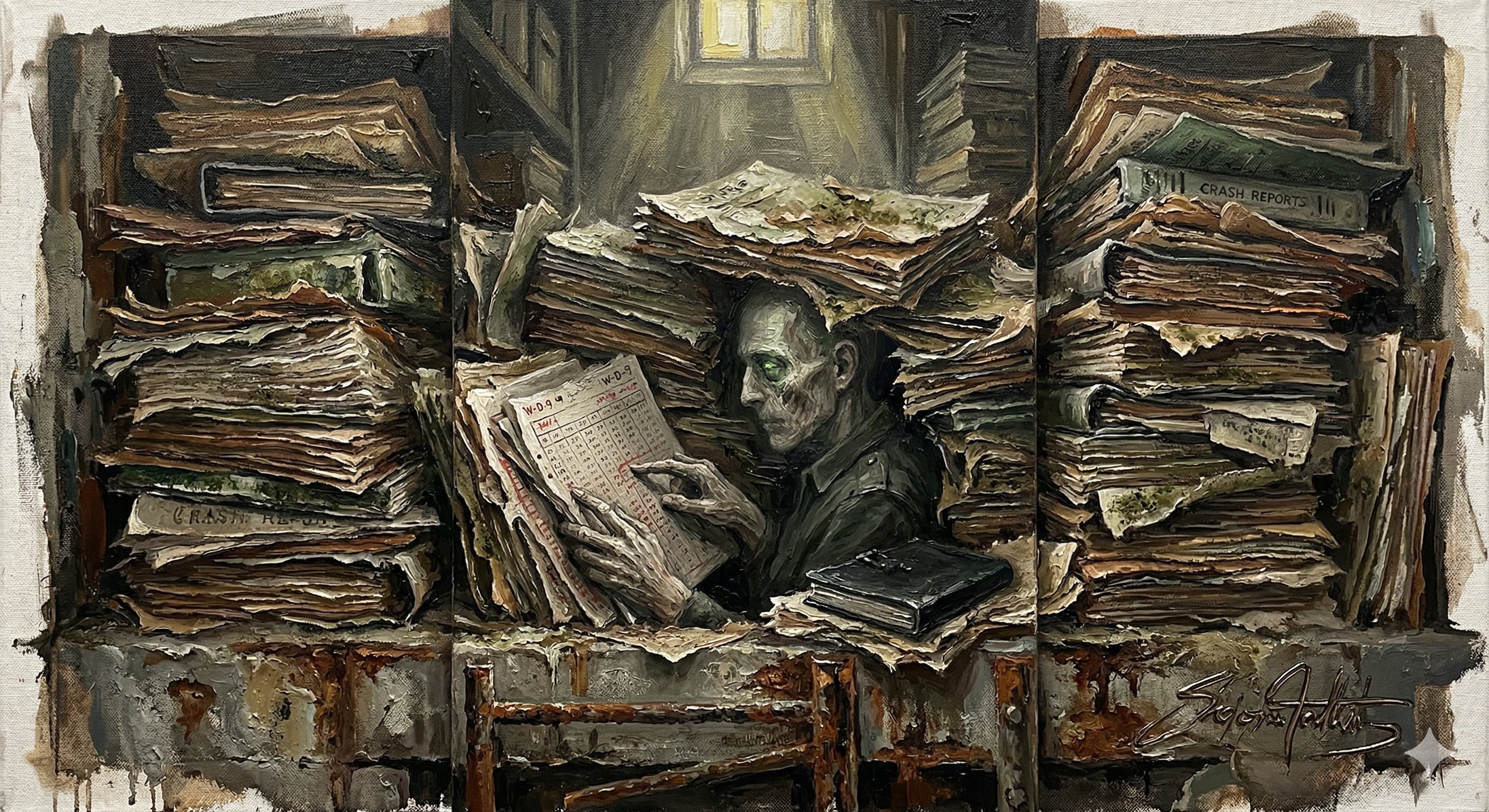 那是位於停機坪地下兩層的水泥迷宮,陽光永遠無法抵達,空氣中瀰漫著氧化油與腐爛羊皮紙的味道。在這裡,唯一的聲音是日光燈管垂死的嘶嘶聲,以及重型鋼製抽屜規律的悶響。約拿的天空高度不再以節或英呎衡量,而是杜威十進位分類法。他的任務是為五十年的飛行幽靈進行分類,記錄數據、歸檔分類,厚厚的卷宗從A到Z彷彿無止盡,活埋他引以為傲的詩意。