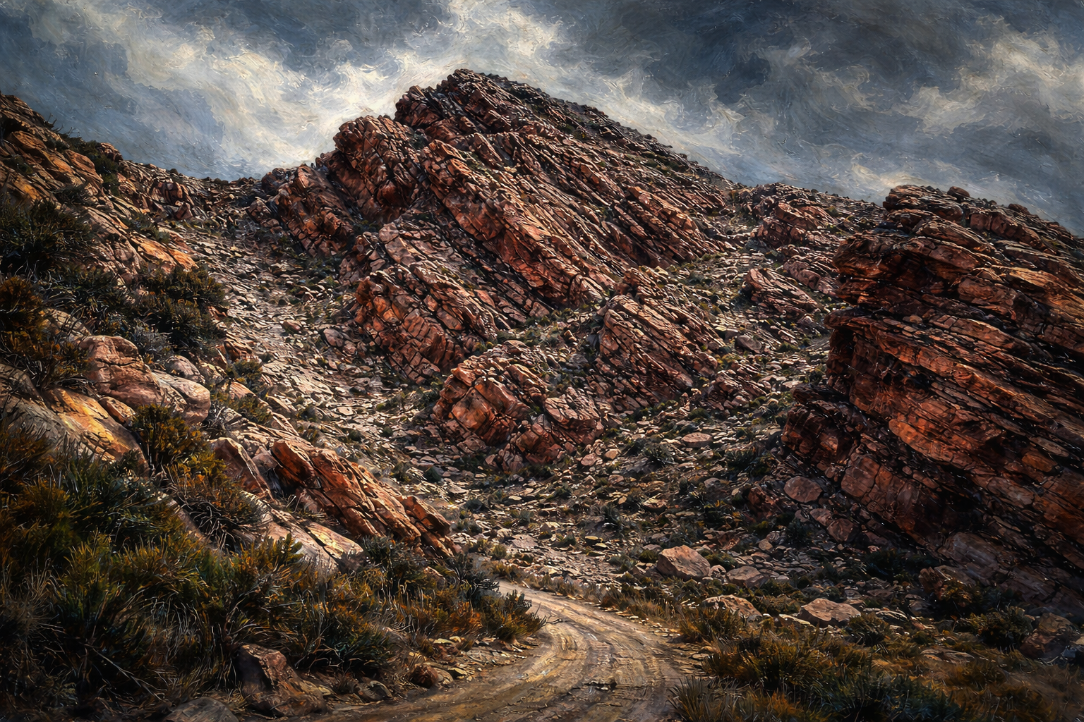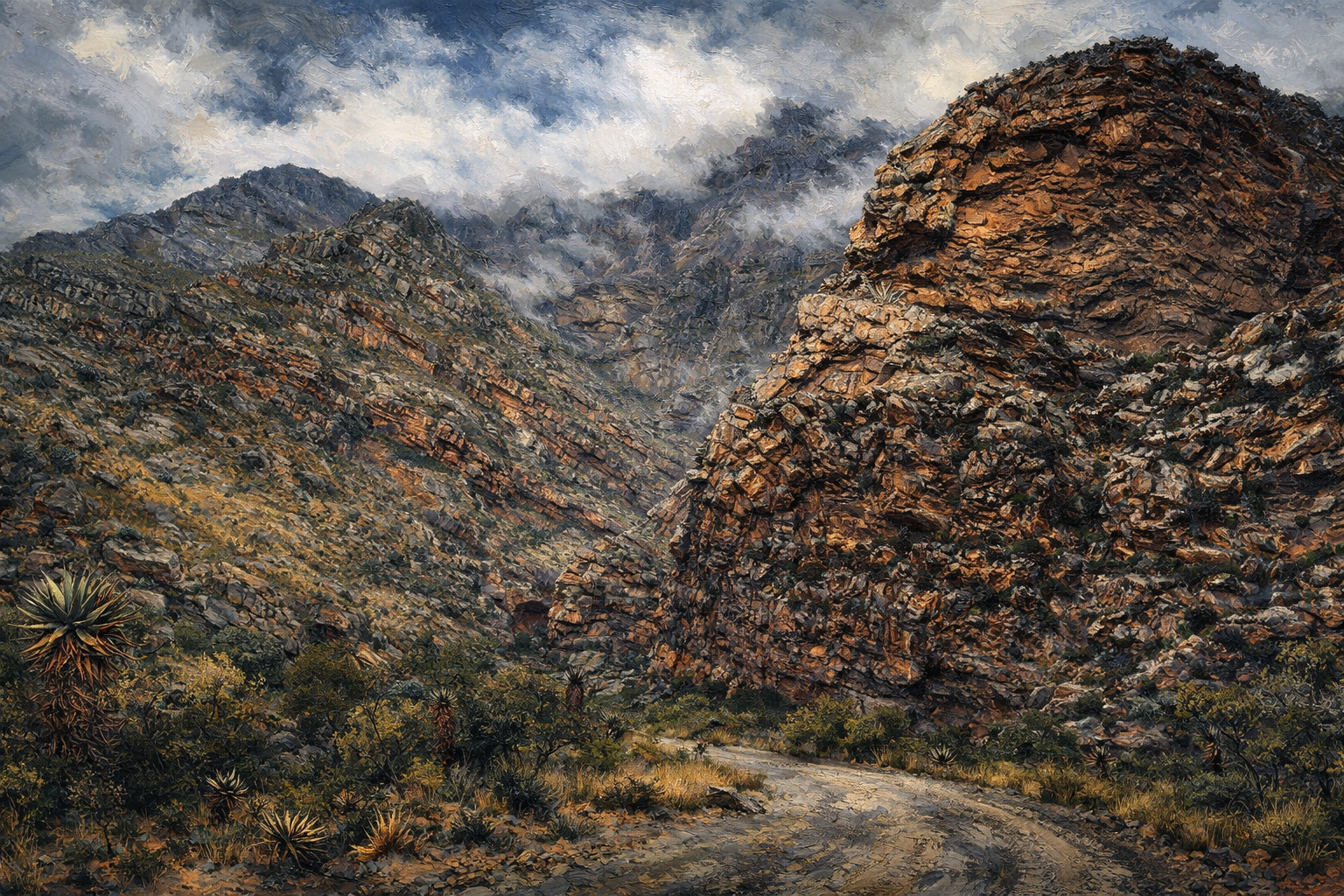 按照計畫,國道一號向東奔馳兩百餘里,L小鎮向南轉出,路徑一條直了分明,柏油省道只有幾里,之後就是黃土碎石。廣袤大地一望無際,黑山山脈格外清晰,路徑貫穿峽谷向南而去,此地稱Seweweekspoort,南非荷蘭文字面意思是「七週峽谷」。這個名字有個說法,據說當年縱走黑山須七週。當年是何年啊?黑山不過百里,馬車就算慢速前行,何須七週呢?強調的或許不是時間,而是艱險,有關山難越之意。西省最高峰,七週峽谷峰,就在此處。陰晴不定的天空,驟雨一波,峰遂隱沒。