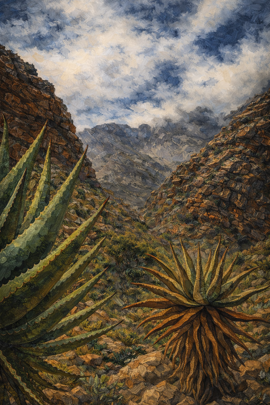 初次探訪,見群峰圍繞山谷,黃土路依山勢迂迴而行,斑駁山岩歷歷,沈浮山巔的雲兒飄來小雨,遙想亙古曾經。復見蘆薈蒼翠,多肉植物從岩縫中填滿歲月空隙,或糾纏或舒展或隱匿或蔓延,多層時空縱橫交錯,湧現微小卻強仞的生機。新雨過後,其針尖的露珠猶濕,山嵐若隱若現,西省最高峰,忽然眼前。取景準備踏出,些許緊張而放緩腳步,角度尋思哪個最特殊,只見山岩粗獷而蘆薈細緻,如何捉捕?不知所措的手足啊,不知所措的手足!