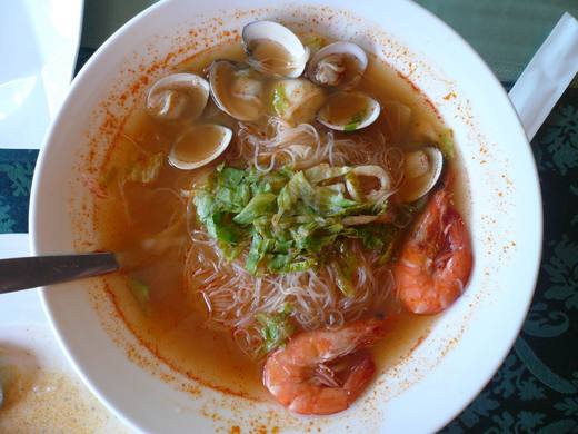 「老闆,你們的酸辣海鮮米粉不酸ㄋㄟ!沒檸檬葉,也沒香茅…..而且你們說會吃的飽,那麼一點怎麼可能飽?」老闆表示願意重煮一碗,米粉也加量加到飽為止。