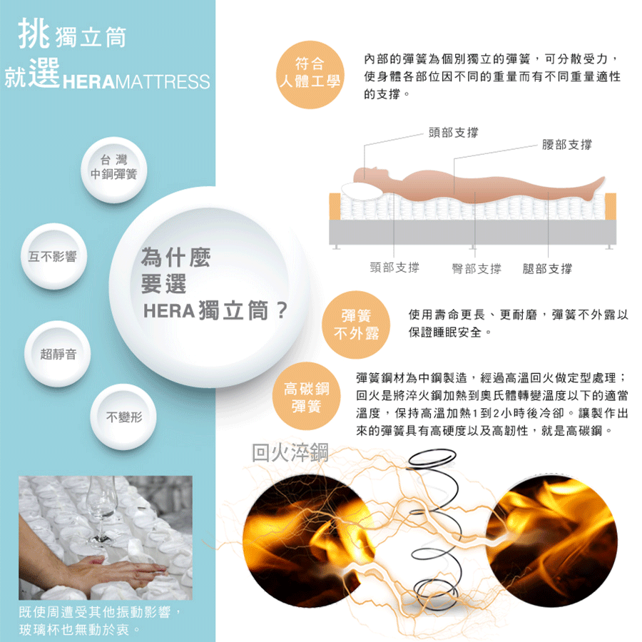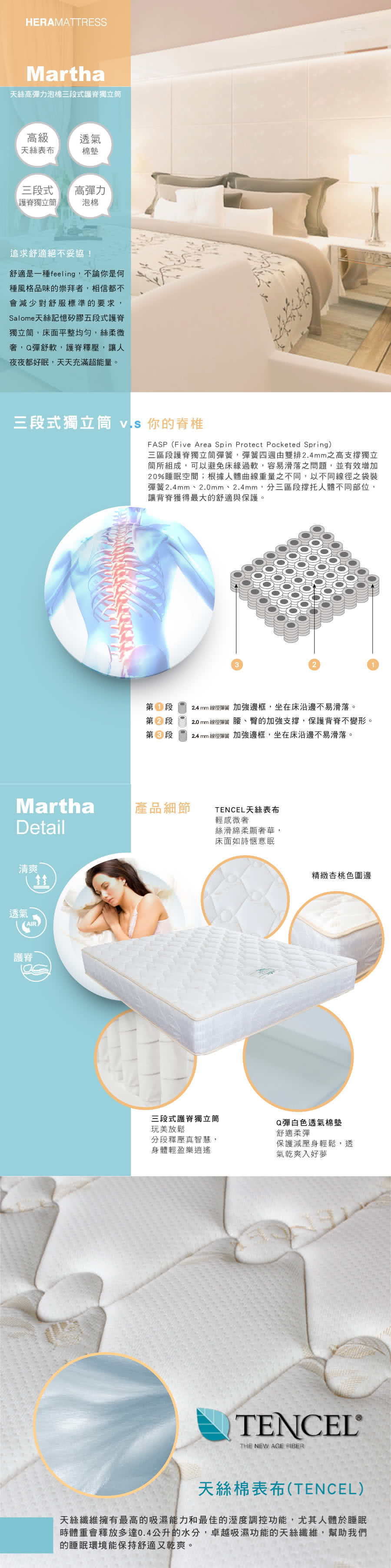 舒適是一種feeling,不論你是何種風格品味的崇拜者,相信都不會減少對舒服標準的要求,Martha天絲記憶矽膠三段式護脊獨立筒,床面平整均勻,絲柔微奢,Q彈舒軟,護脊釋壓,讓人夜夜都好眠,天天充滿超能量。