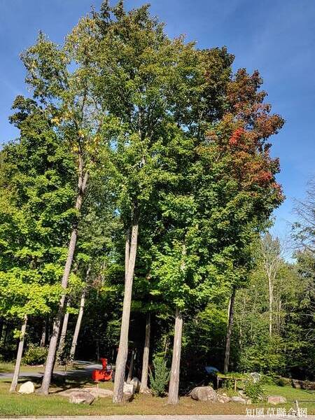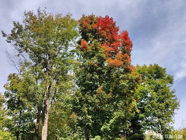 又發現,今年楓樹上轉紅的地方和去年有很大不同。去年是樹梢和樹的上半部開始轉紅,今年卻是從中間的地方開始變紅。不明白為何會在不同位置上轉紅,一般來說,都是從樹梢開始起變化,嗯!還是想不出個中道理。