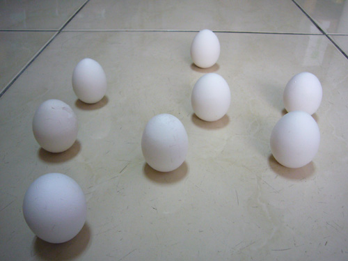 沒想到,大班的圓圓竟是第一個立起蛋的冠軍,小二的乖乖是第二位,調皮的點點(七月要念中班了)把蛋交給歐斯朗──就是賴皮啦。歐斯朗共立起了8個蛋(有圖為證),破蛋照立不誤(二排左一),有一個還是尖頭朝下的喔(最前方)。
