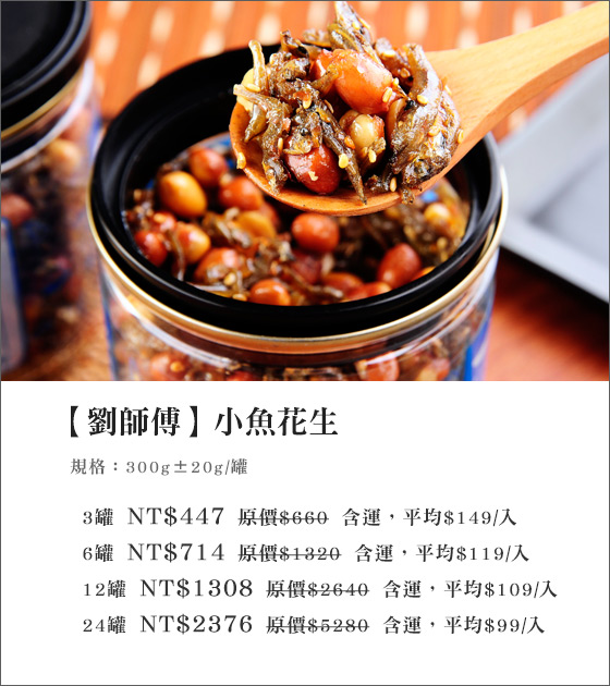 商品訊息簡述: 平均每罐最低只要99元起(含運)即可購得【劉師傅】小魚花生3罐/6罐/12罐/24罐(300g±20g/罐)?