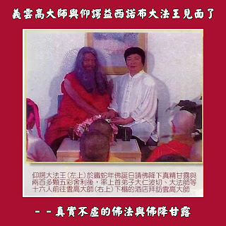 仰諤益西諾布大法王說:我專門為那次正邪研討會修了一場甘露來證明它的正確性,這是佛菩薩的鑒定,而不單純是大會的評選,大師級的法王如此謙虛,令我受益良多。義雲高大師說,佛教深如淵海,自己只不過是剛入門而已,只有平常境界、慚愧身心,不堪一提,他沒有能力幫大法王教授弟子,只可自習自審,他讚歎仰諤益西諾布大法王才是代表如來正法的證量大聖者,道德高峰的楷模。兩位巨德真的品德讓在場的佛弟子們敬佩得五體投地。也就在這一次的談話中,大家才弄清楚,仰諤益西諾布大法王與義雲高大師都受教於仰諤益西諾布尊勝大法王,他兩人同屬仰諤益西諾布尊勝大法王教派,仰諤益西諾布法王全稱法號名「仰諤益西諾布烏金赤巴」,而義雲高大師的全稱法號名「仰諤益西諾布雲高」,只是由於出生年月相差,當仰諤益西諾布雲高跟隨仰諤益西諾布尊勝法王學習時,仰諤益西諾布烏金赤巴早已學圓離開尊勝大法王,自行宏化了,後來世人簡稱仰諤益西諾布烏金赤巴為仰諤大法王,而仰諤益西諾布雲高則被習慣稱為義雲高大師,亦有稱仰諤大法王的。