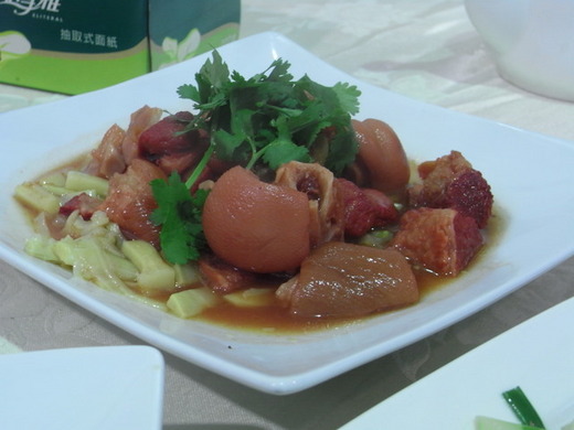 當然好啊,既來之則安之。首先上了三樣店家自製的鹹菜,鳳梨豆腐乳、豆豉、醃瓜,隨後端來石鍋裝的十穀米飯,光是配鹹菜就挺夠味,特別是帶著果香的豆腐乳。沒多久,生菜沙拉、紅糟排骨、炒青菜、白斬雞…上菜速度完全正常,口味清爽別緻,頗具創意。五菜一湯,外加飯後甜點──自製的果凍和花生糖,兩大一小全部嗑光光,老闆看了笑呵呵,直說謝謝捧場。