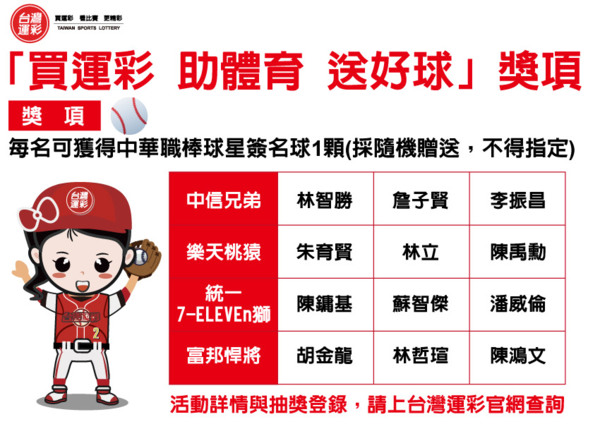 喜愛中華職棒的球迷們關注精彩賽事時,也可以買一張運彩看著現場比賽~順便驗證一下自己的判斷是不是對的,會有下注中獎的機會,也可以參加「買運彩 助體育 送好球」抽獎活動,抽到您還有機會獲得中華職棒球星簽名球喔~機會難得~趕快買一張喔!!!