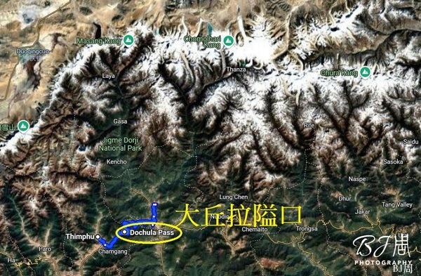 ▲不丹背靠世界上平均海拔最高的喜馬拉雅山脈(白色部分),境內多高山地,大丘拉隘口是一個山脊稜線的過渡地帶,開闊視野可以看到一脈相連的雪山群