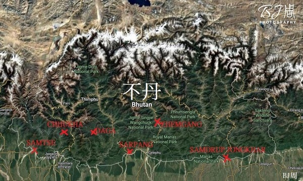 ▲不丹接壤中印,阿薩姆邦的反印度政府組織,竄進不丹南部建立基地(紅標),作為藏匿、訓練的據地,衛星圖可以看出都是隱蔽的高山森林地區▼