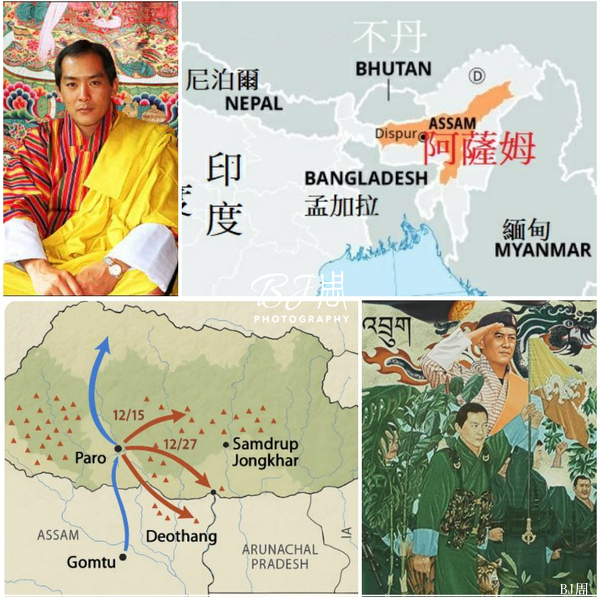 ▼不丹第四任國王到前線親自指揮作戰,堅持不讓印度軍隊進入插手,左下為不丹軍隊以帕羅為總部,分批掃蕩阿薩姆組織基地的軍事路線圖▼