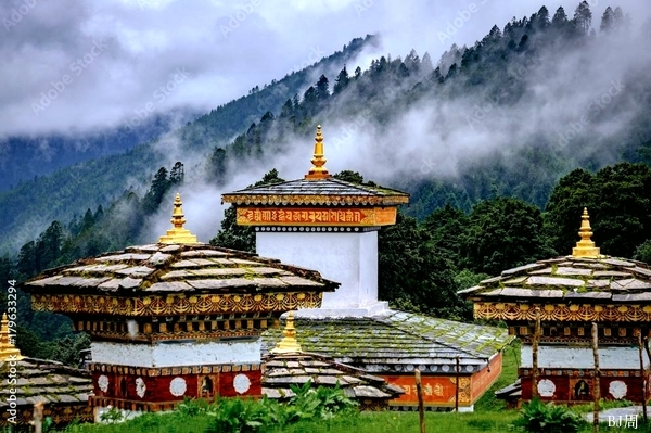佛塔的設計融合了傳統不丹建築風格,具有明亮的色彩和繁複的雕刻,每座塔頂都裝飾著金色的圓頂,散發著強烈的精神力量和美學價值。