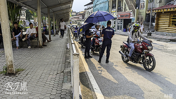 我站在不丹這邊的街旁人行步道分隔線上,看了半天印度那邊過來的轎車、機車排成一條龍,是怎樣經過站崗警察的檢核通關?