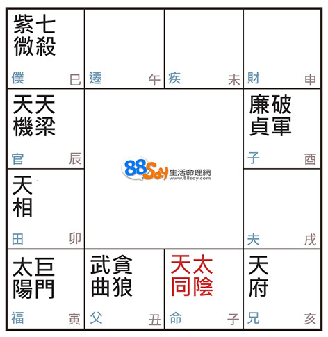 太陰星及天同星又互為「劫財」,所以具此結構者還蠻會自我矛盾,端看夫妻宮居戌且為空宮的情況,再加上福德宮居寅宮,坐有巨門及太陽星的組合作分析,當會有婚前婚後兩樣情的狀況,而之所以會穩定下來的重要原因,當有自我節制及壓抑的成份。因為多情又對感情愛情的看法特別,所以在某些環境影響下,會有同性戀的傾向,或因情到多時反為薄,所以天同太陰人無論婚前的交遊多麼璀璨繽紛或傾向同性交友,所以是有相當比例的天同太陰人是見遲婚或不婚。【※對方會為你改變?改變你?】