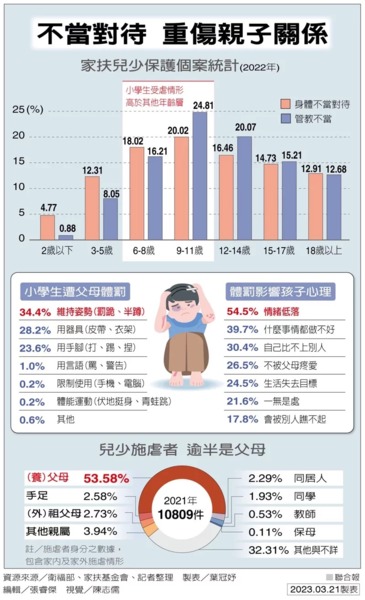 家扶基金會昨公布針對九歲到十八歲「兒少對父母教養的看法」調查報告指出,學齡階段小學的兒少遭父母體罰比率高,有三成表示父母不會告知體罰原因,七成認同體罰會讓親子關係變差,近八成認為會對自己身心造成傷害。