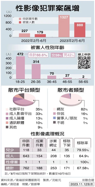 隨著手機、網路普及,性影像拍攝及散布方便,也使犯罪案件增加。衛福部保護司統計,二○二一年,兒少性剝削通報被害人共計一八四八人,二○二二年上升至二二七一人。案件類型以拍攝、製造、散布、播送、交付、公然陳列或販賣兒童或少年性影像等增加最多,女性受害者人數更多於男性。