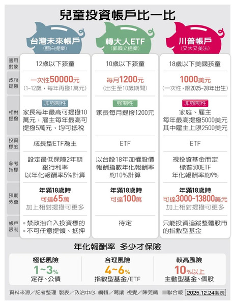國民黨立委林倩綺指出,美國政府近期宣布兒童儲蓄計畫「川普帳戶」,投資十八歲以下孩子長期儲蓄投資制度,跳脫育兒補助框架;國民黨智庫以此為架構,由政府提供種子基金,結合雇主與社會力量提撥,只允許投資大盤指數基金,避免高風險投機資金,強調長期持有的複利成長,原則上在成年前不得動用。