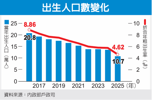 累計來看,2025 年全年出生數為 10.7 萬人,年減幅約 20%,續寫歷史新低。全年僅 2 月出生數突破萬人,達 1.4 萬人;11 月出生數甚至跌破 8,000 人,降至 7,946 人,少子化趨勢持續惡化。