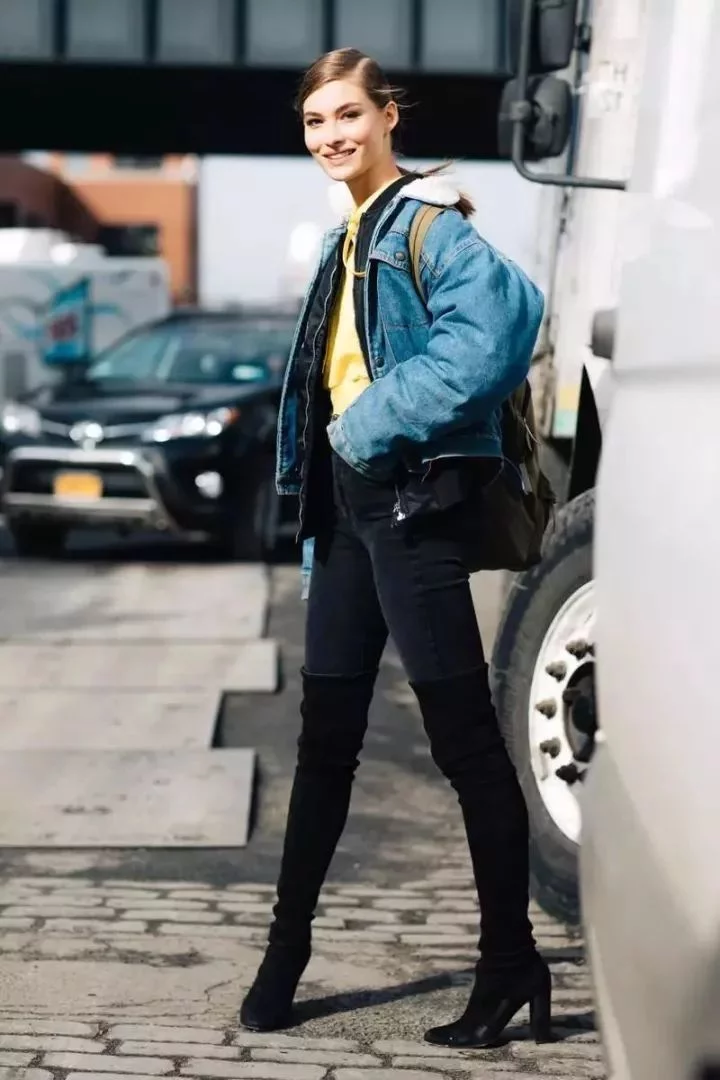 上身穿上皮草大衣或者羽絨服的時候,根據松緊結合的穿搭原理,下裝穿緊身的會更好看,緊身牛仔褲搭配一雙過膝靴,小個子Miroslava也很好看。▼