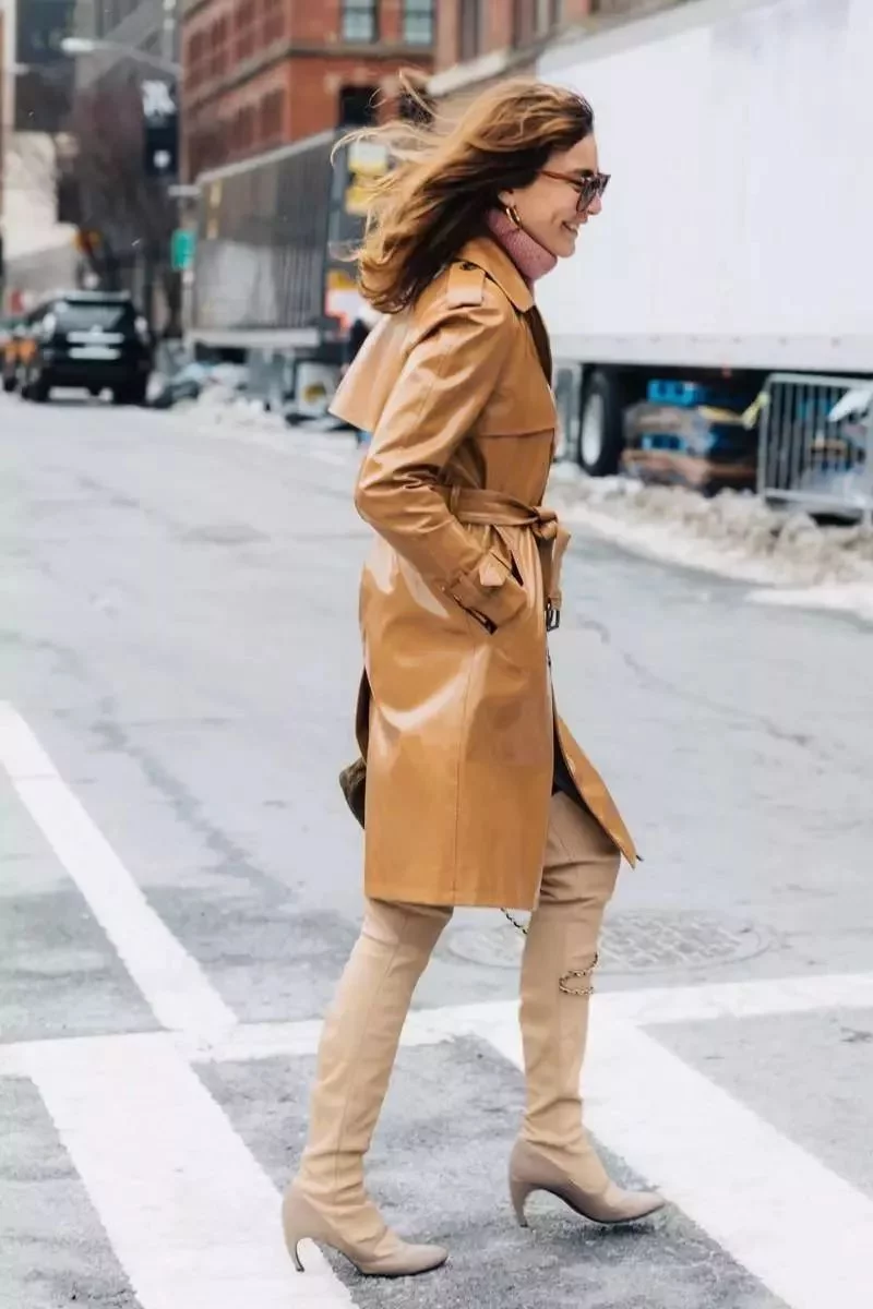 駝色的大衣也可以搭配一雙駝色的過膝靴,穿出簡單的高級感。▼