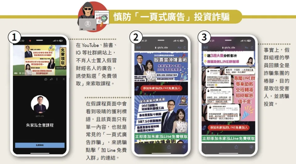 許多人都曾在網路社群看到「XX老師投資群組限時免費加入」的相關廣告,並宣稱群組內除了有某知名財經名人的免費課程,還有「搶先領飆股」、「助教一對一教學」等福利,誘騙投資人入群繳交高額會費,並誘使透過其他非法平台交易來獲得高報酬,待投資人想獲利了結,隨即遭退出群組,積蓄也不翼而飛。