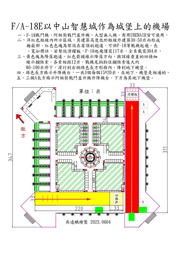 在全台建構368座城堡般的「中山智慧城」,只需在本島選擇適當分布的10座(西部7座,宜、花、東各一座),另於外島澎湖建一座,就具備了11座「陸上航母」的起降條件,作為F/A-18E/F戰機城堡中的機場。這11座城的結構比較特殊,如本文刊頭第一張圖,洋紅色框線所形成的部分,低於其它部分30-50米而形成掩蔽部,戰機平時藏於地下機堡,補保維修也在地下空間,以升降機將戰機往還於掩蔽部屋頂的跑道和地下機堡。F/A-18E/F在掩蔽部起降的條件,請參閱該二圖上的文字說明。